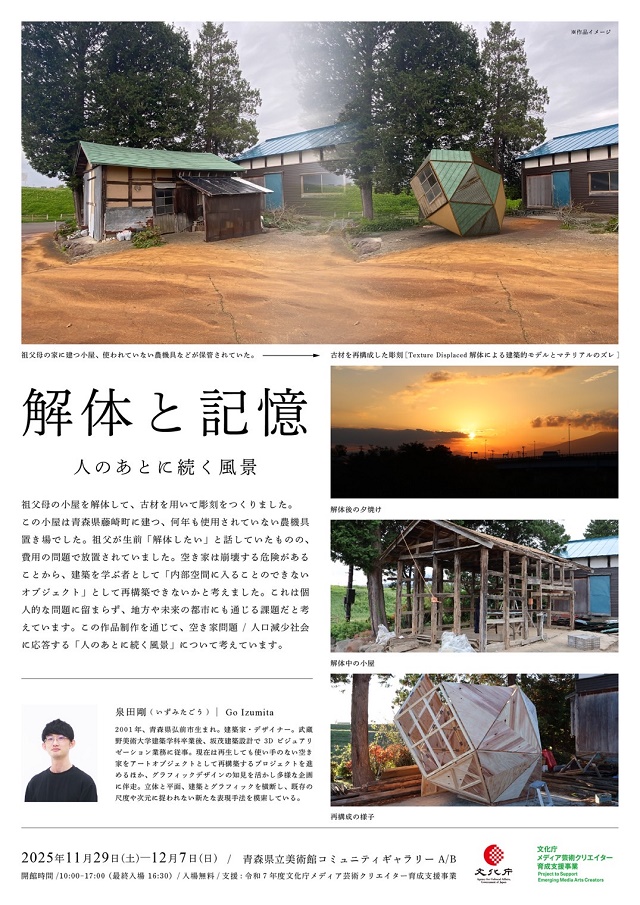 2020年3月に本校建築科を卒業した泉田 剛さんが、令和7年度文化庁メディア芸術クリエイター育成事業の支援を受け、青森県立美術館コミュニティギャラリーA/Bにて作品を展示することになりました。詳細については以下リンクおよびリーフレットの画像を確認のうえ、是非足をお運びください。